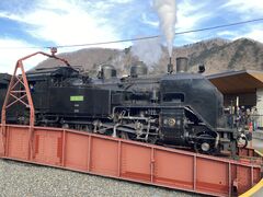 湯西川温泉へのバスを待つ間にSLの転車作業を見学。迫力あるSLを一目見ようと多くの人が集まっていました。