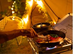 東京スカイツリータウン(R)の庭はスカイツリーを見上げながら手ぶらで楽しめるグランピングBBQ施設です。人気はマルチグリドルを使用したグランピング料理や初めての方でも安心のアウトドア機材を使った「キャンプ飯」。スキレットを使って調理する鶏肉の枝豆のアヒージョやメスティンを用いて30分燻製焼きをする燻製豚バラブロックなどが人気メニューです。また、2階フードマルシェ(食品売場)で購入したBBQ食材を持込みをすることも可能です。季節を問わずオールシーズン運営中で、冬季はあったか鍋メニューなどをお楽しみいただけます。グランピングテントは6台+3台完備しており、1ブース最大8名様までご利用可能です!
