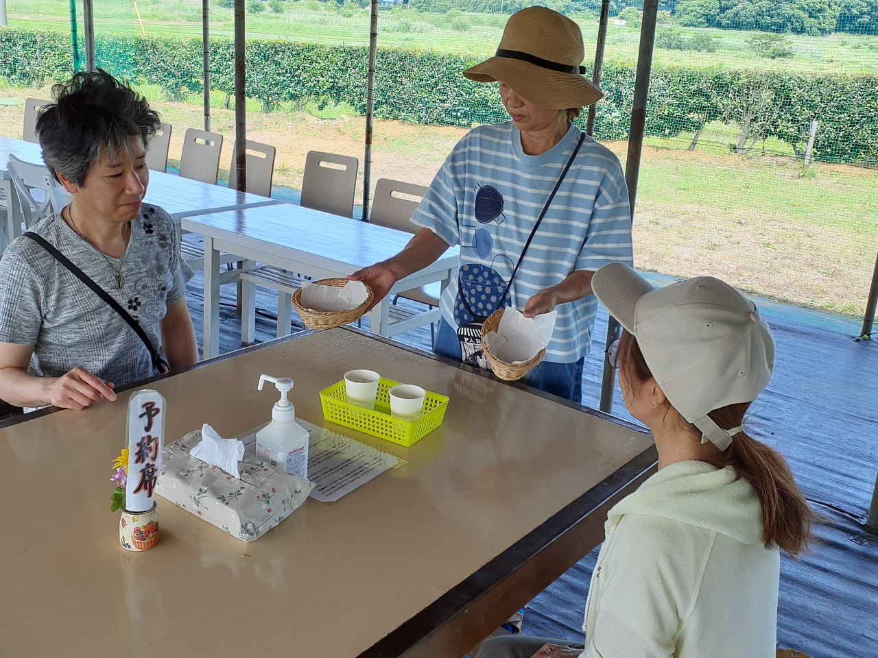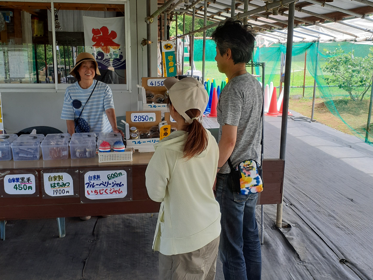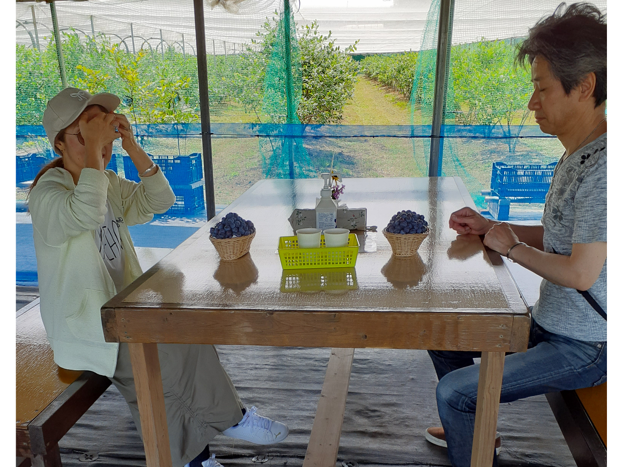 広くて大きな屋根の涼しい休憩所で、冷たいお茶と一緒に食べるブルーベリーは、とてもおいしいです。残りは、パックに詰めて全部お土産で、お持ち帰りできます。