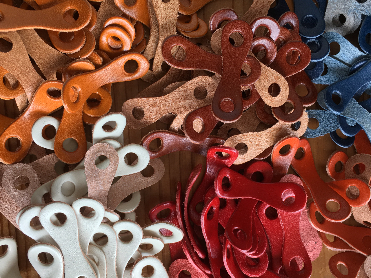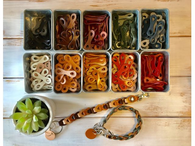 11色からお好みの色をお選びいただき、めがね型の革をつないで、キーホルダー、ブレスレットを製作していただきます。