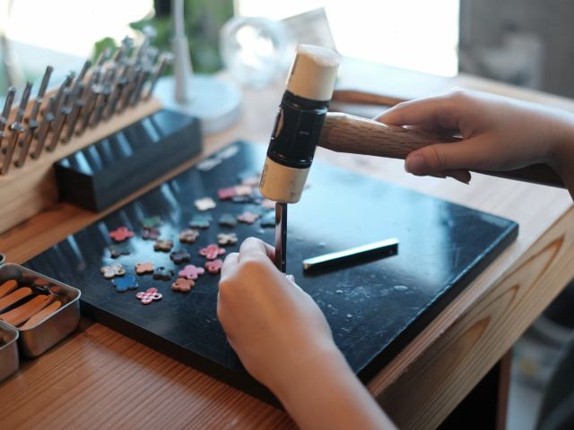 革チャームにアルファベット、数字、模様の刻印をしていただきますので、あなただけのオリジナルの革小物が作れます!