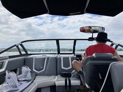 ボートがつくる波に乗るサーフィン、『ウェイクサーフィン』です!