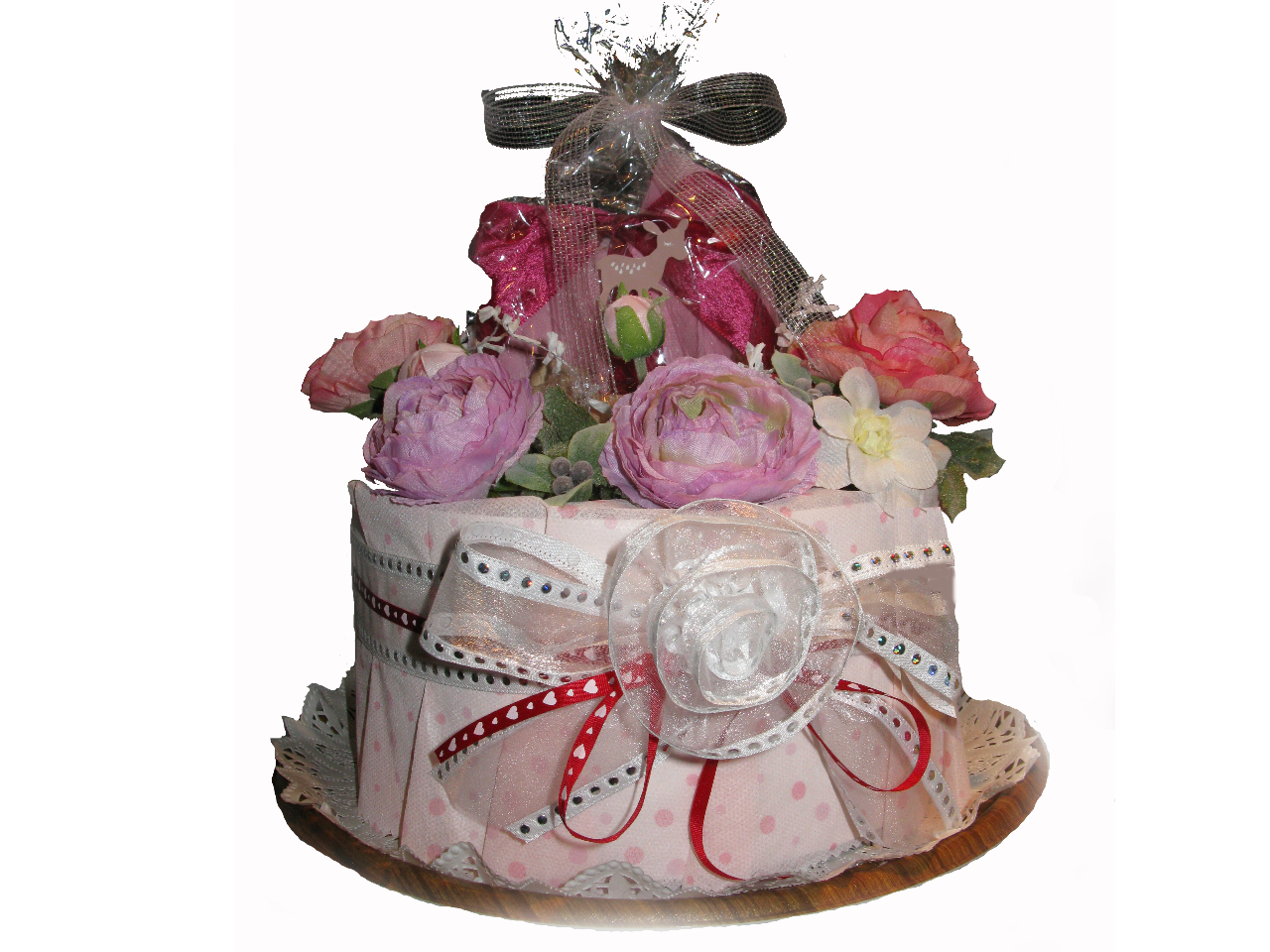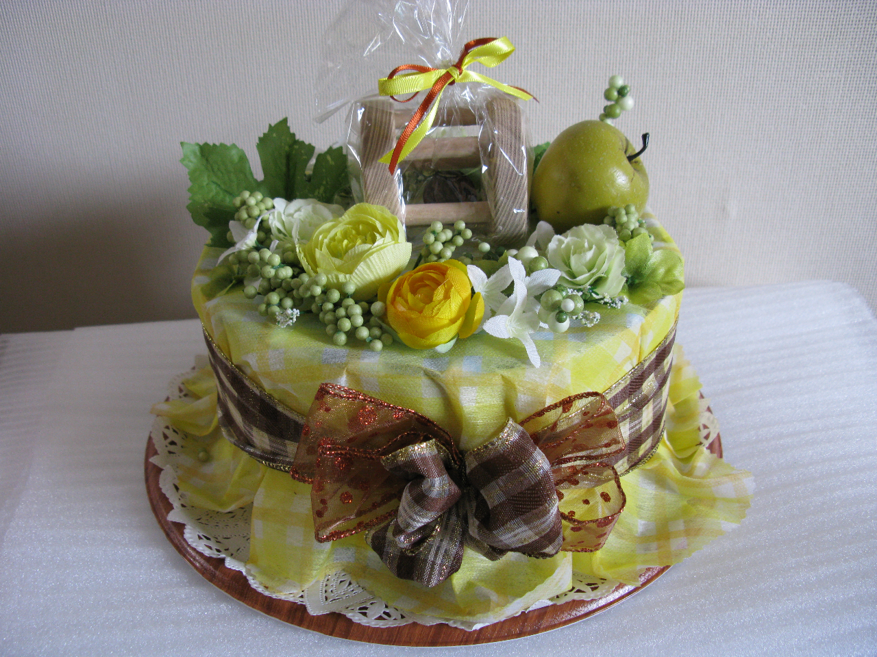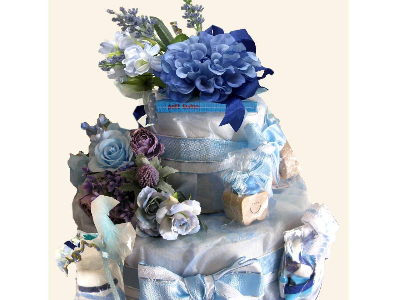 出産のお祝いに必需品の紙おむつや赤ちゃん必需アイテムをショートケーキ、ロールケーキ、ホールケーキなどのお祝いケーキを作り、更にラッピングして仕上げます。