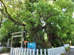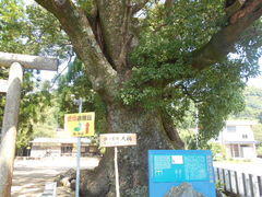 JR紀勢本線の那智駅近く、浜の宮王子跡に鎮座する熊野三所大神社の境内に聳える楠の大木です。推定樹齢800年と云われ、幹元から二つに分かれている事から夫婦楠とも呼ばれています。