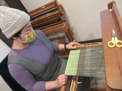 難しいかなと心配していましたが、少し教えてもらったら、おもいのほかすいすい織れて、時間内にちゃんとマフラーが出来上がって、帰りは巻いて帰りました。