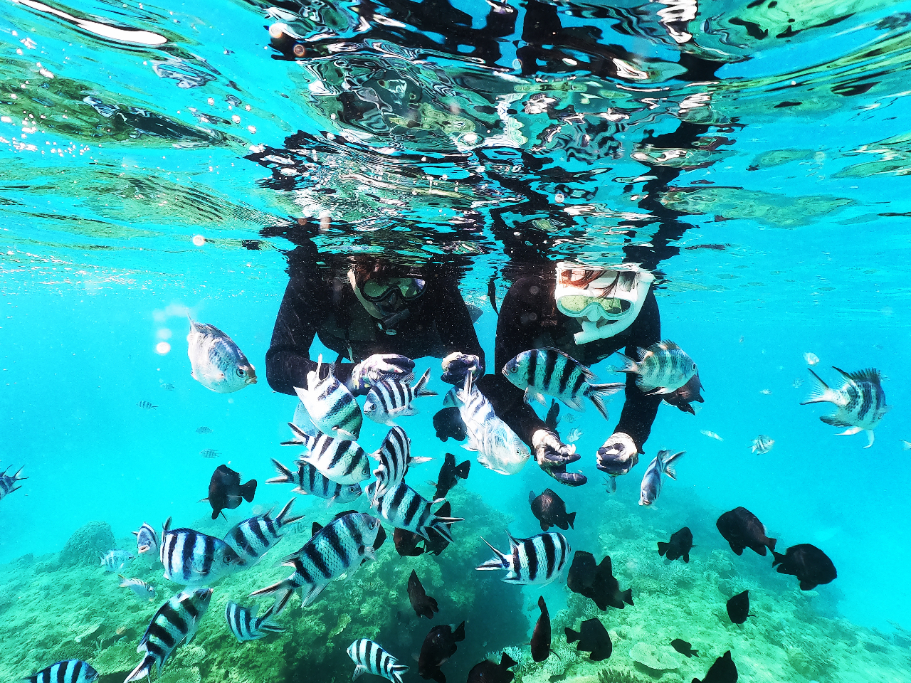 綺麗な珊瑚と沢山のお魚囲まれながらお魚に餌付けをしている風景!まるで水族館みたい!!
