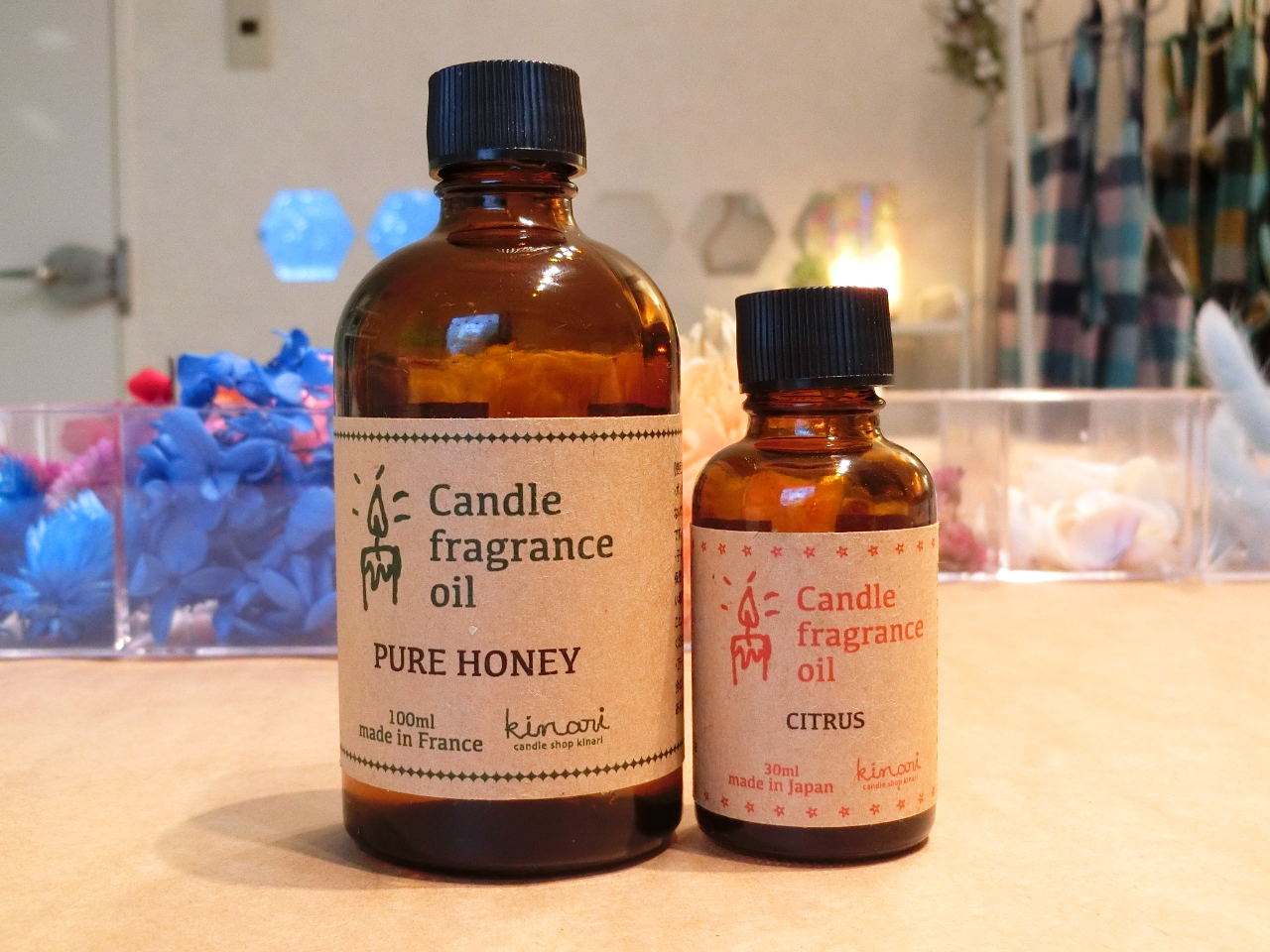下の層はお花を透明のジェルキャンドルで閉じ込め、灯す上の部分は天然素材でススの出にくいソイワックスを使用し、香りもつけて作ります。