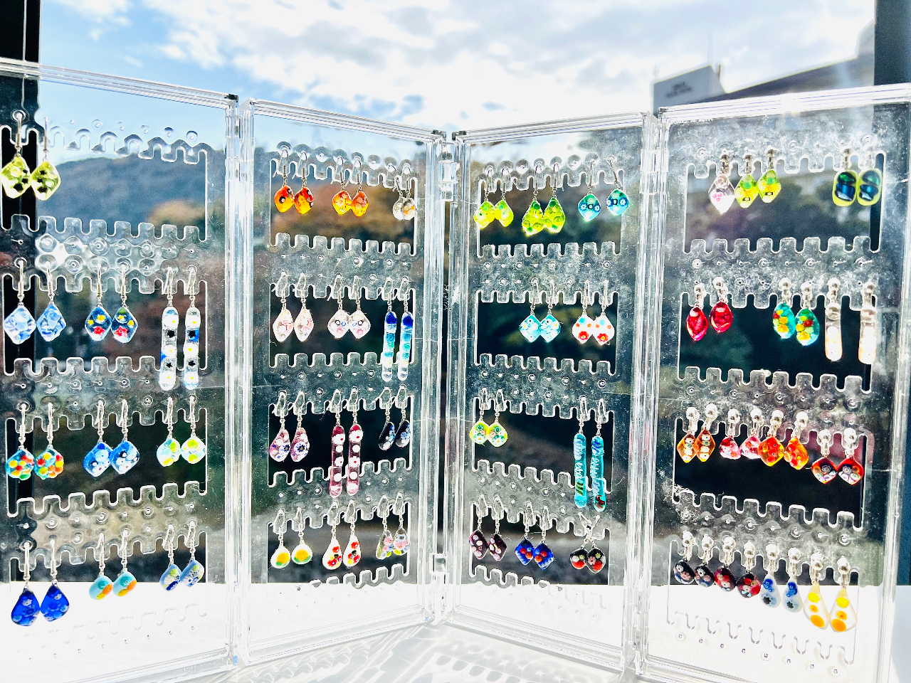 26色のガラスを使い、お気に入りのイヤリングorピアスを作ることができます。