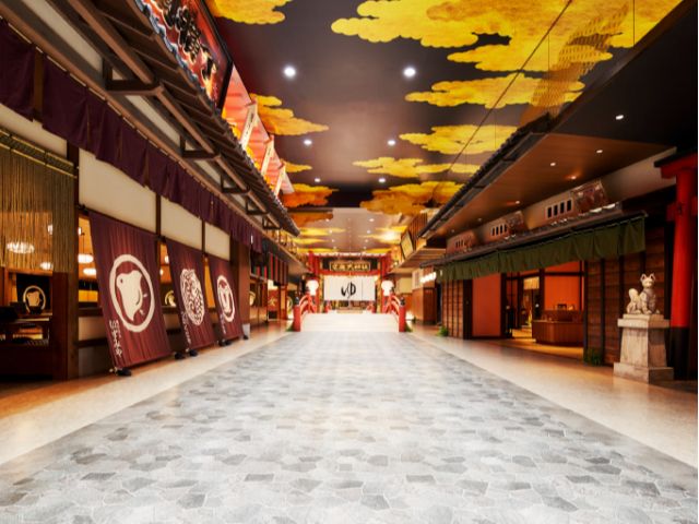 →館内レストラン(食いだおれ横丁)、カフェ(小町茶屋、殿下茶屋)、空庭屋台など、多様なフードやドリンクをお楽しみください