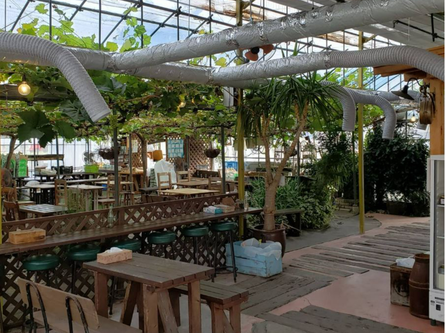 天井には美しいぶどうの樹が張り巡らされ、落ち着いたウッド作りのカフェスペースが出迎えてくれます。