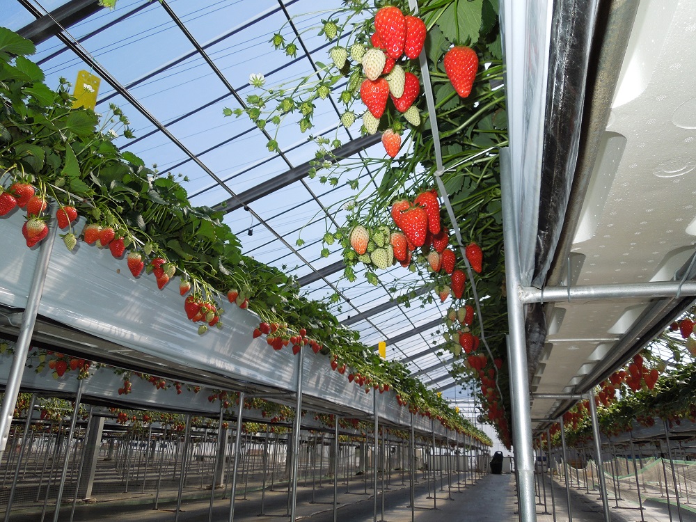 通路の幅はやや狭めかもしれませんが、腰の高さでかがまずに右手も左手も苺…という夢のような空間です。