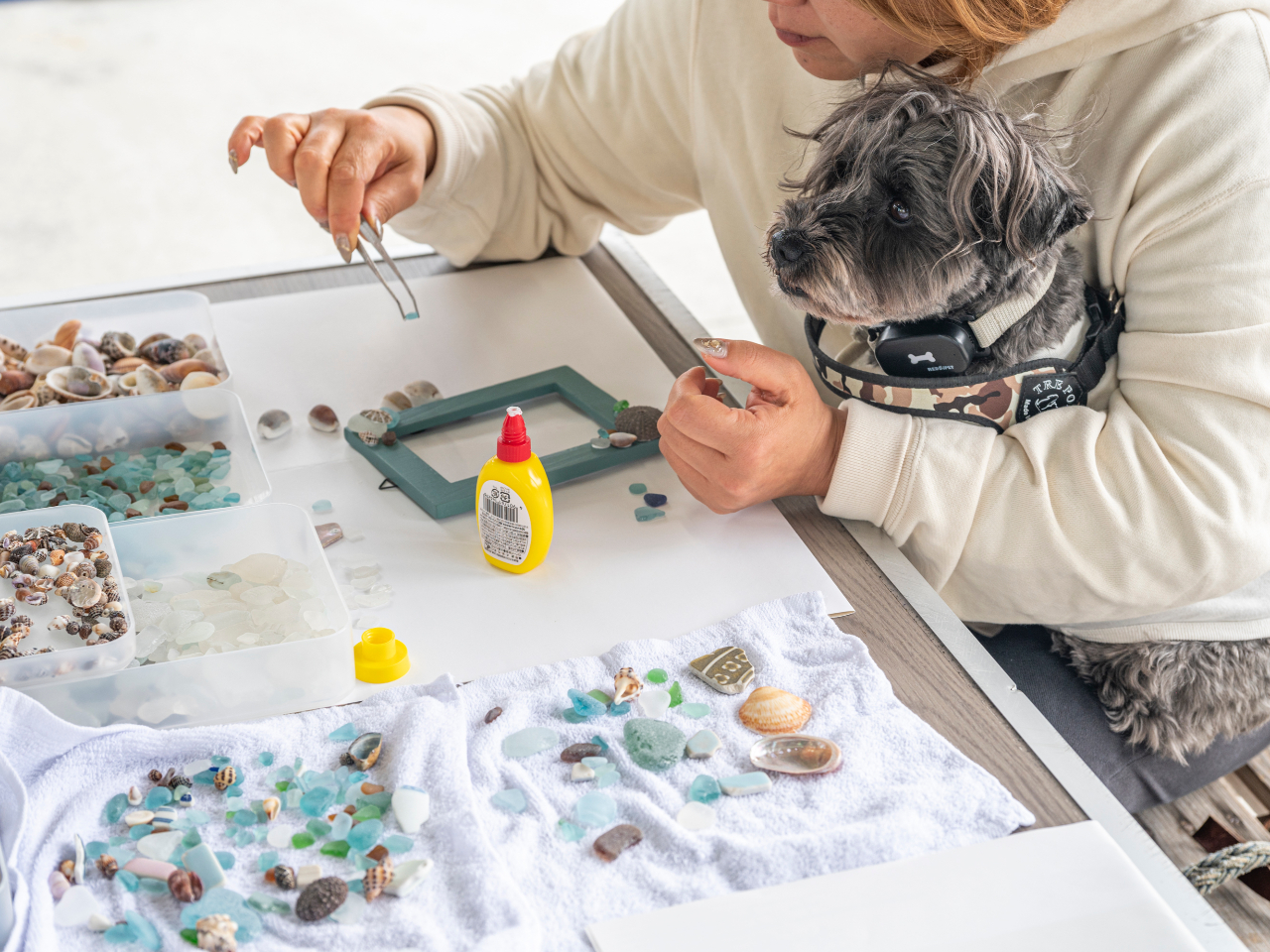 ワンちゃんと一緒に、美しいシーグラスや貝殻を拾える海岸へ行き、ビーチコーミングをやってみよう!収集したものを使って世界にひとつだけの作品をつくろう!