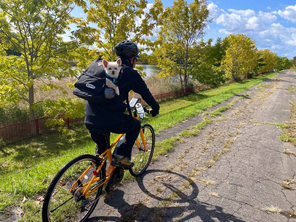 伴走車で大曲園地(9月:ひまわり・コスモス)へ。サイクリングスタート