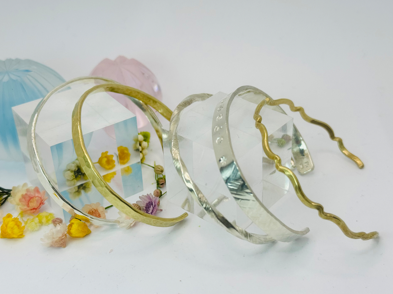シルバー、真鍮(ゴールド色)、K14ピンクゴールド、K10、K18イエローゴールドのリングが作れます。バングルに変更も可能です。