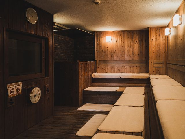 画像は浴場内サウナ。女性浴場には中温サウナの他にスチームサウナもあり、スチームサウナでは無料の塩を体に塗り込むことにより塩サウナとしてもお楽しみいただけます。