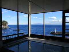 3〜4階相当の高さから真正面に伊豆大島が見える展望風呂 立ち寄り湯もOKです室内なので天気が悪くても楽しめますよ。