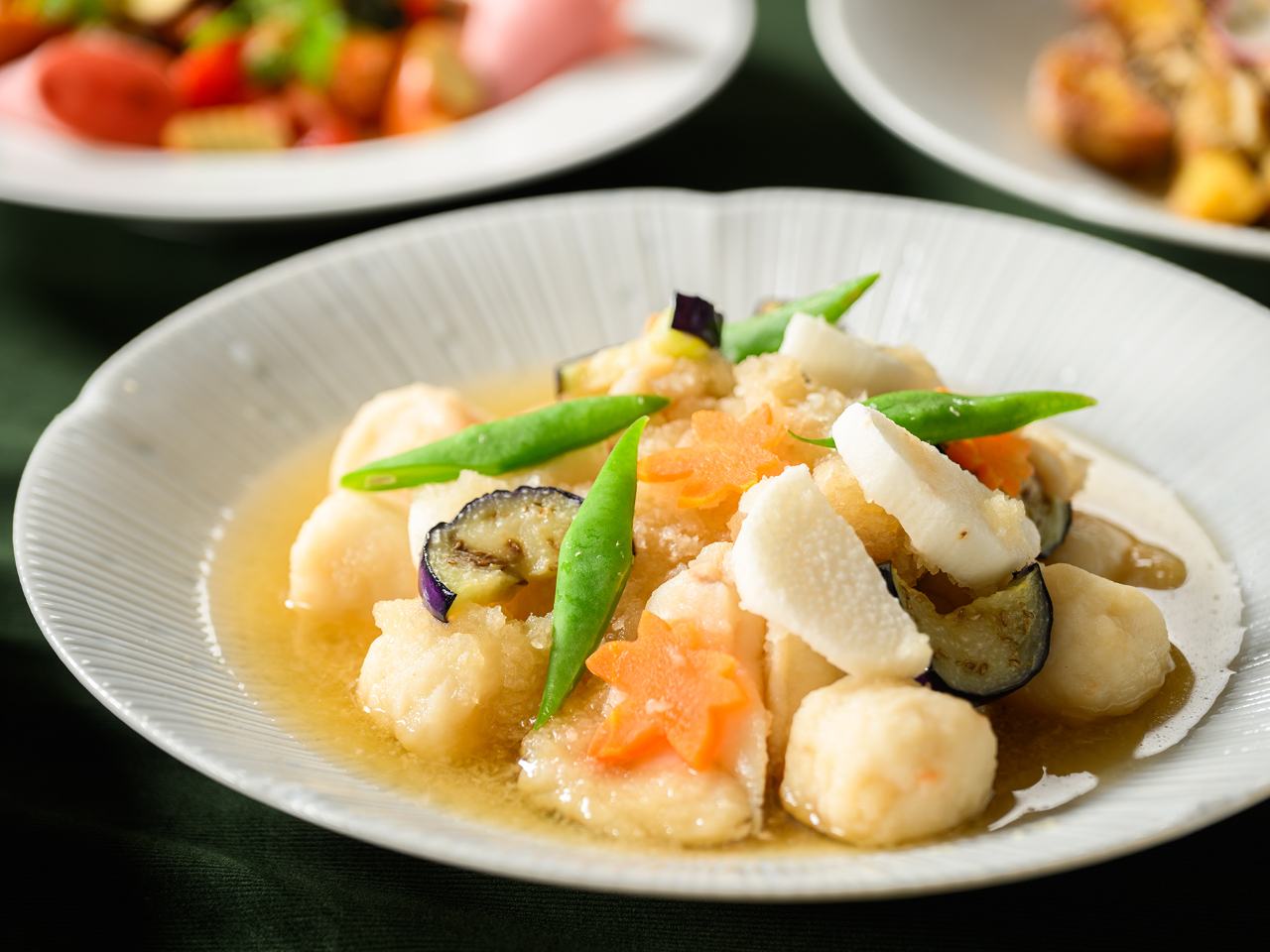 ・鮟鱇と海老つみれのみぞれ八方蒸し紫蘇味噌添え