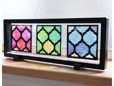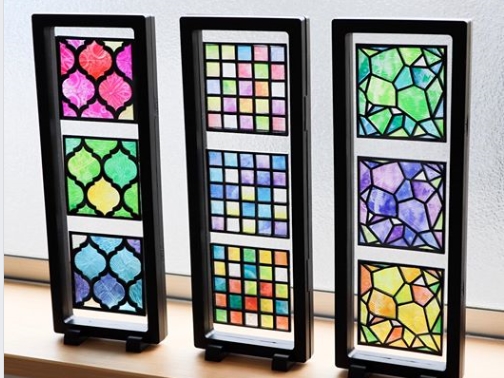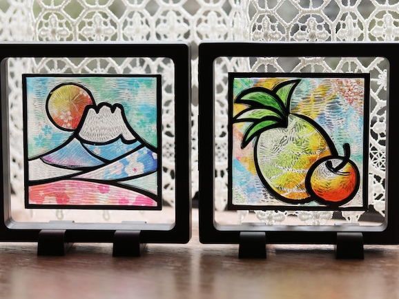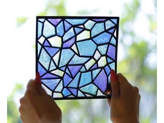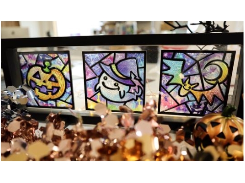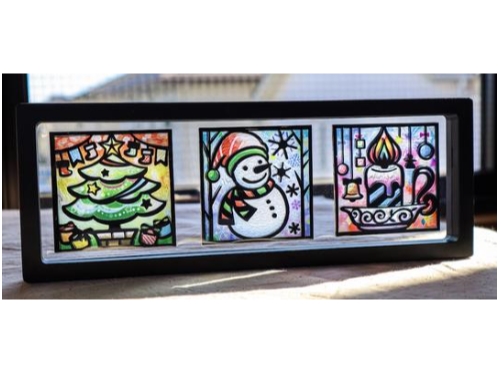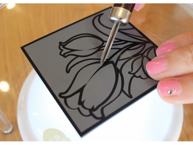 『シャインカービング』とは、ビニールシートに描かれた絵柄に沿って彫刻刀で彫る、新しいアートクラフトです。仕上がりはガラスのような質感で、まるでステンドグラスのような輝きです。