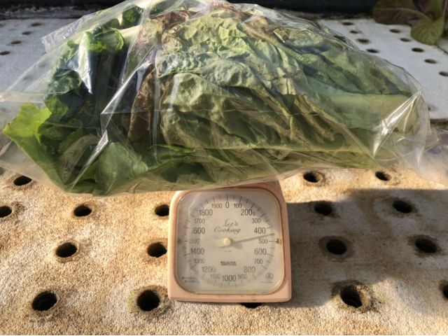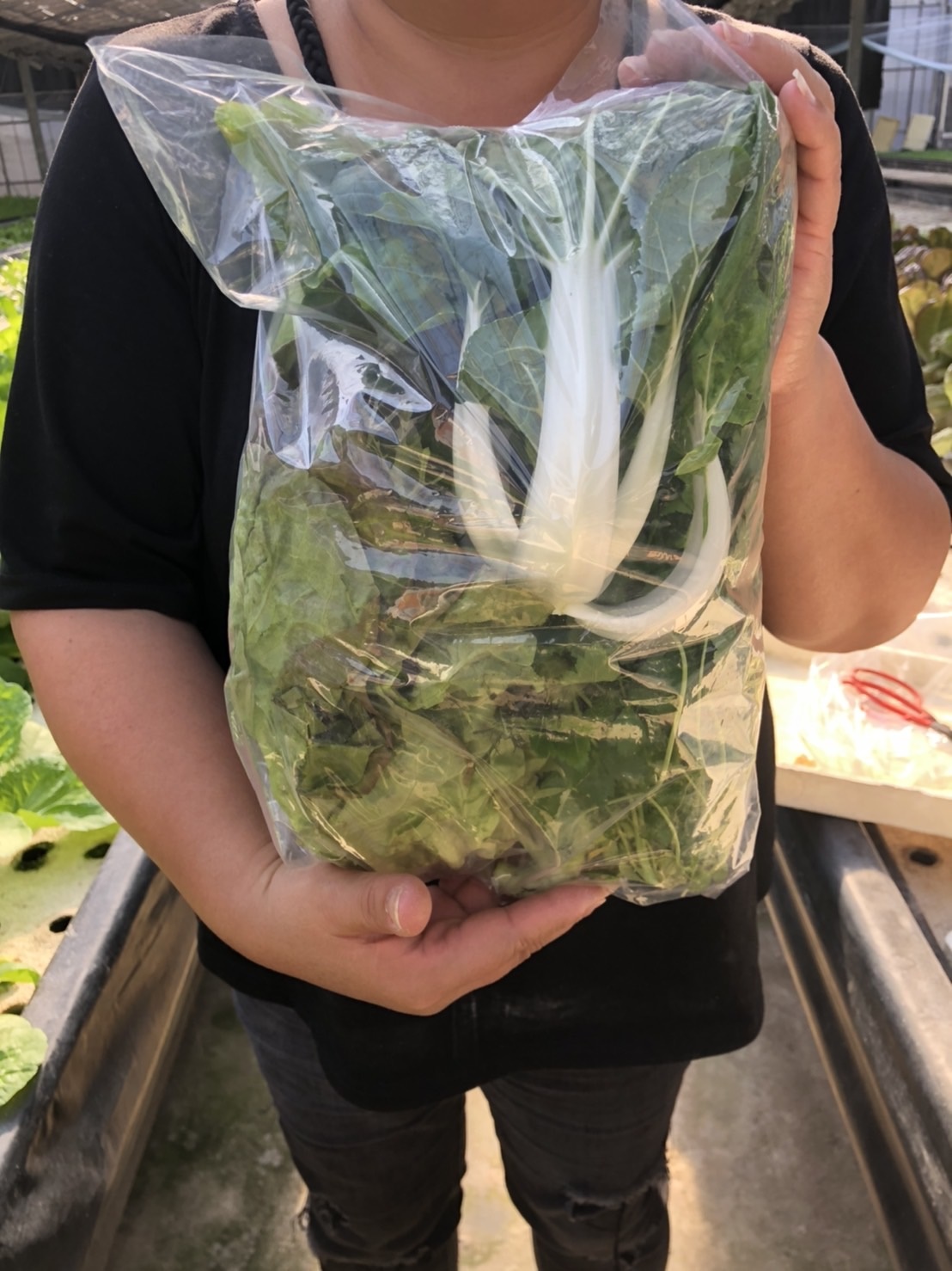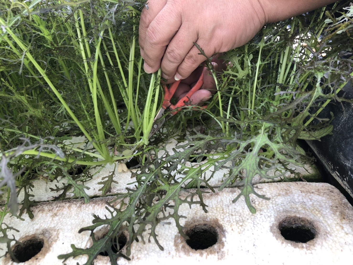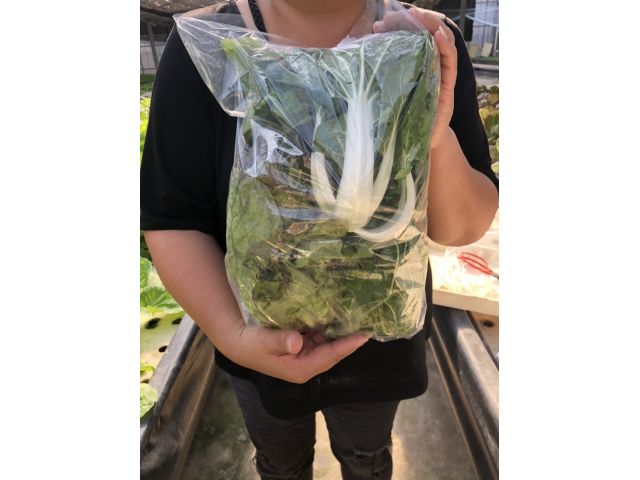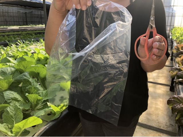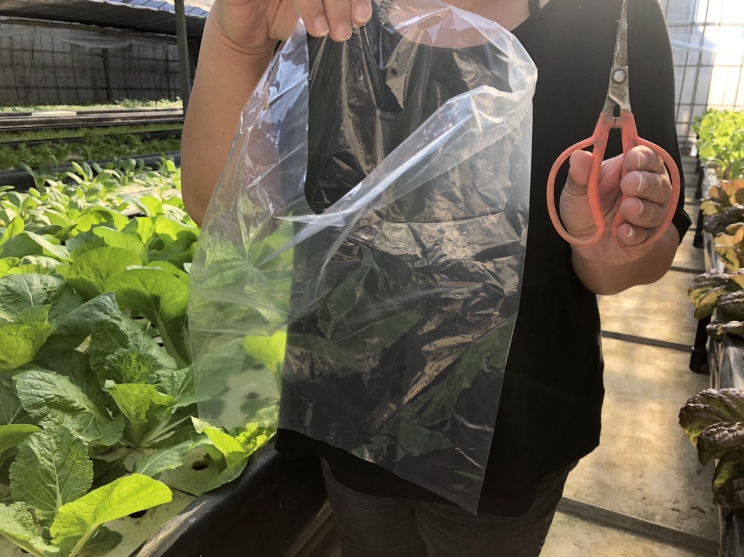 サラダ野菜(水耕)をはさみを使って収穫いただき、約400gお持ち帰りいただきます。
