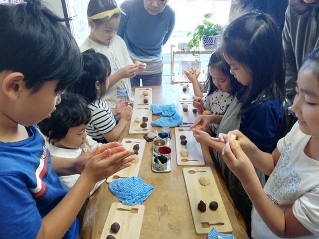小学生のお子様と和菓子作り体験の様子。和菓子作りの後は、お抹茶体験しました。