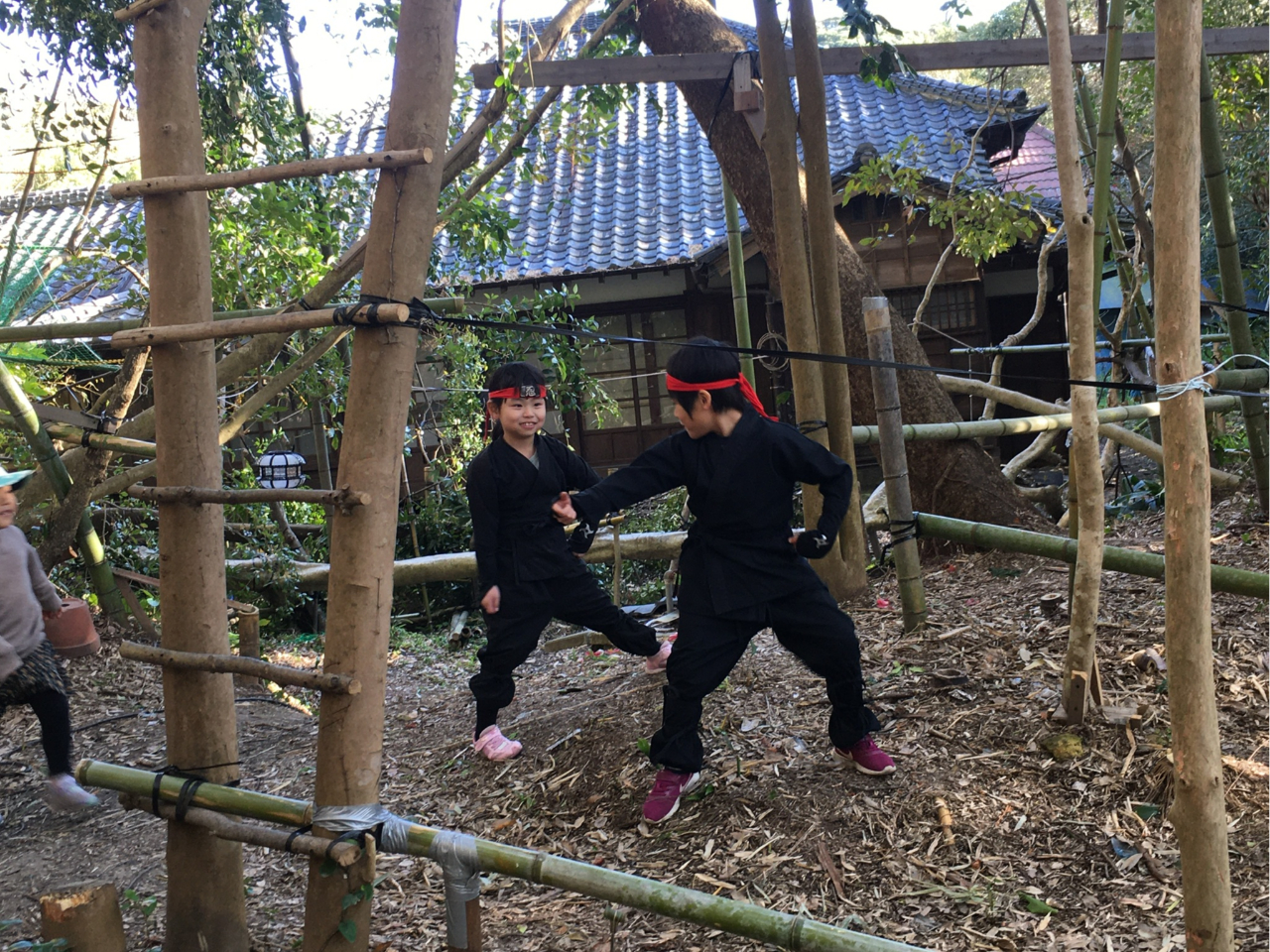 林に囲まれた古民家の広いスペースで忍者になりきり、空中ブランコ、竹ハシゴのアスレチック、忍者屋敷探検、手裏剣、様々な脱日常を満喫できます。ご家族やお友達と一緒に!普段の運動不足も自然に解消できます。