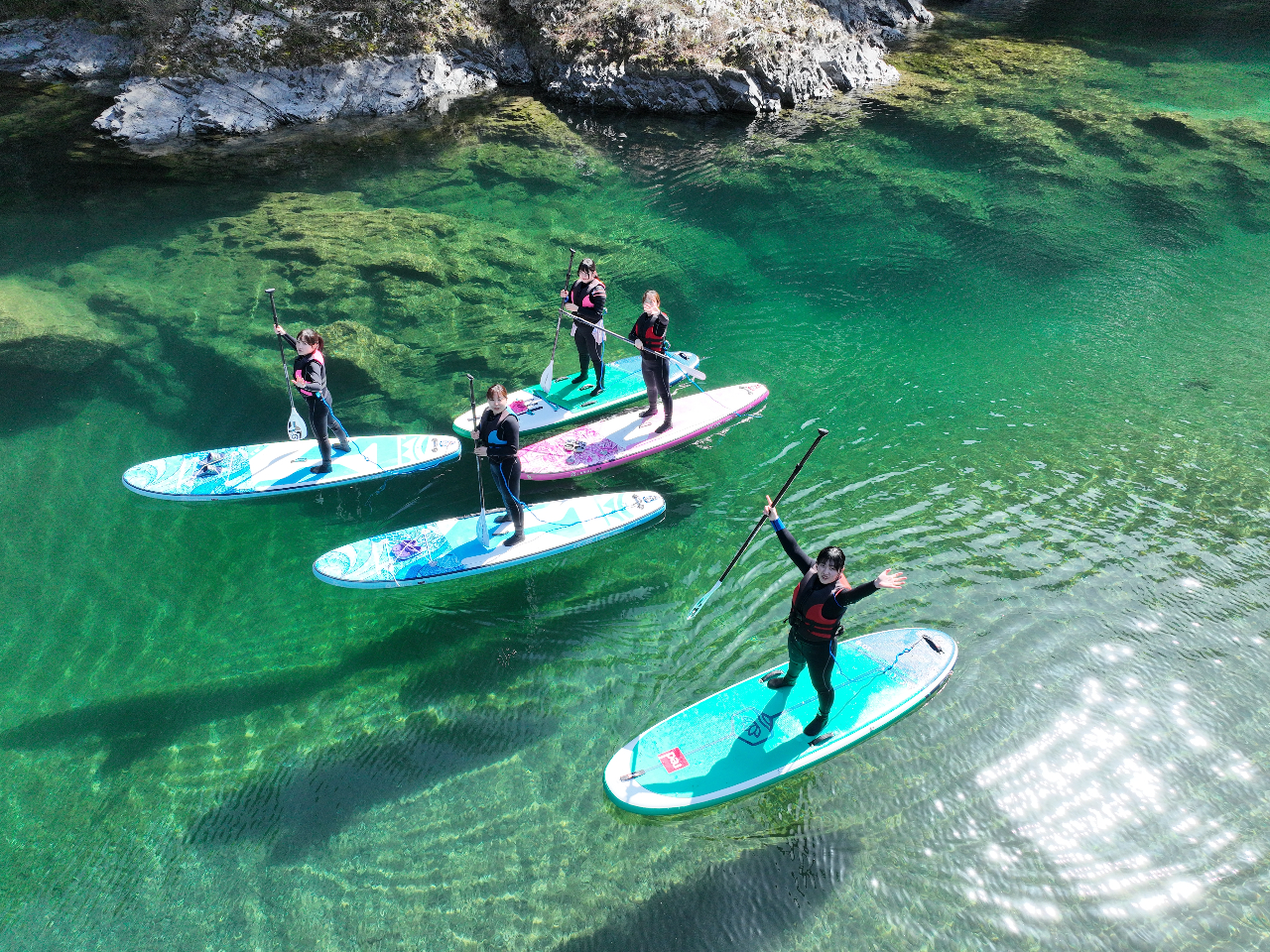 【NOC仁淀川アウトドアセンター】「SUPサップ」全部付き定番プラン/水上カメラ撮影、ドローン空撮、専用シューズ、待合室、トイレ、売店、駐車場完備、レンタルウェア充実(上流仁淀ブルーエリア)