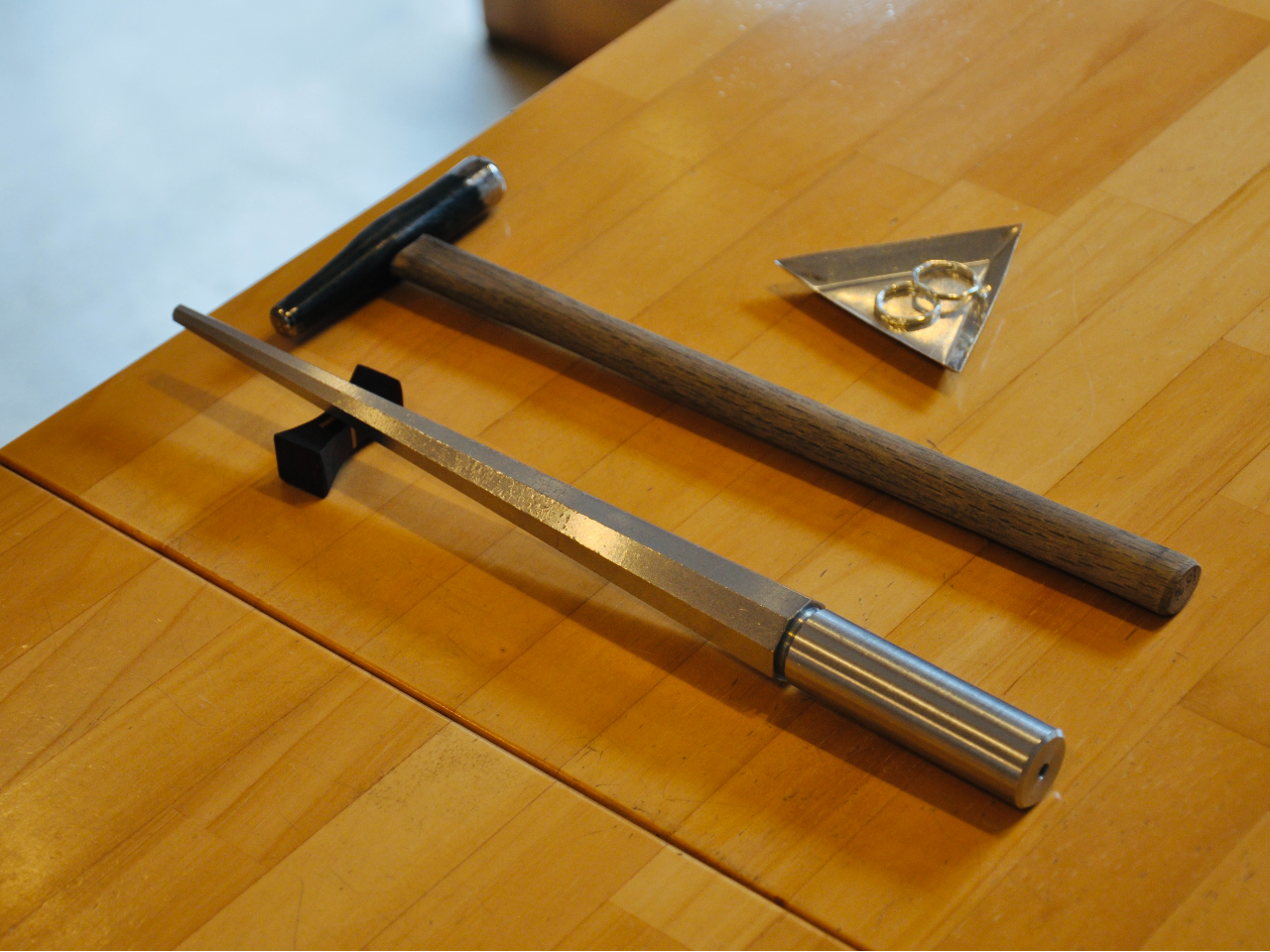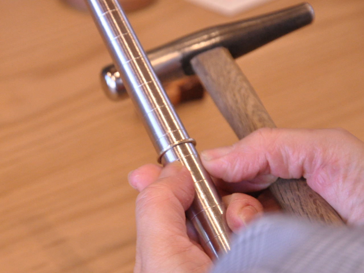 【4】お客様にはハンマーで指輪の表面の模様付け体験をしていただきます。