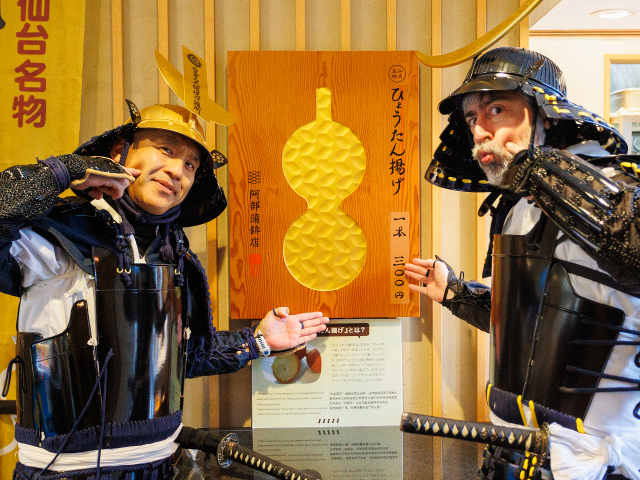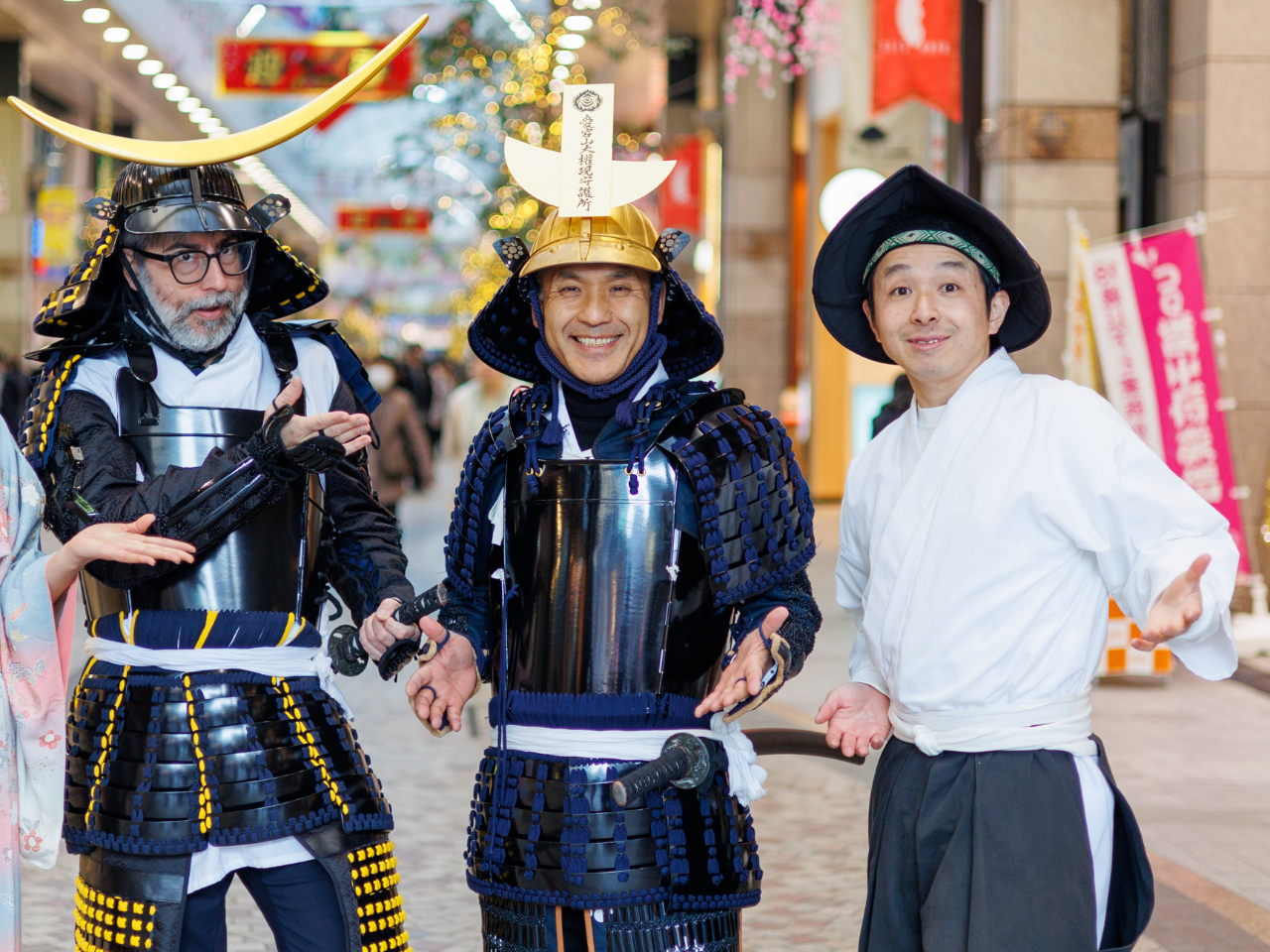 仙台市の中心に位置する商店街を甲冑姿で散策する体験。伊達政宗の甲冑を中心に伊達藩の黒の甲冑を身にまとい、必勝祈願で神社を参拝したり、仙台名物のずんだ餅を食したりとその姿はまるで城下の様子を視察するお殿様。家来の足軽がガイドを行い、お客様をおもてなしします。