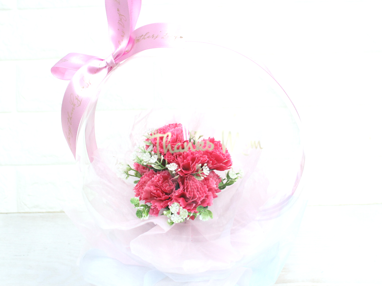 バルーンの中にアーティフィシャルフラワーやドライフラワーの花束などを入れるバルーンアレンジメントです。