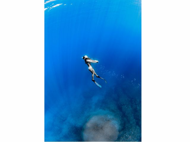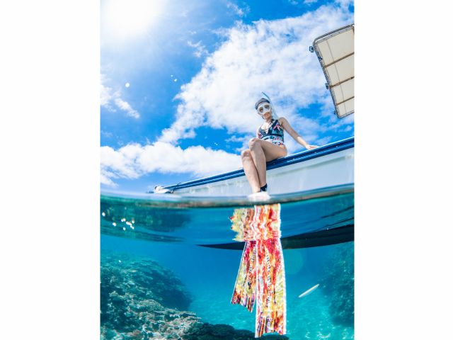 ポイントに到着。さぁ!いざ!無呼吸の世界へ!色鮮やかな珊瑚礁、色とりどりの魚達、なにより透明度抜群の伊江島の海をご堪能ください!潜っていく姿を可愛く、そしてカッコ良く撮影させて頂きます!