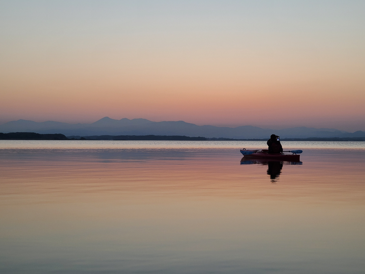 青森・三沢側の湖上から見る小川原湖の夕日は、八甲田をバックにして沈んでいきます。
