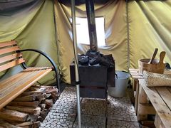 テントサウナにも火を入れてもらい、人生初テントサウナ体験も最高でした。薪の爆ぜる音や匂いに包まれながらリラックスできました。