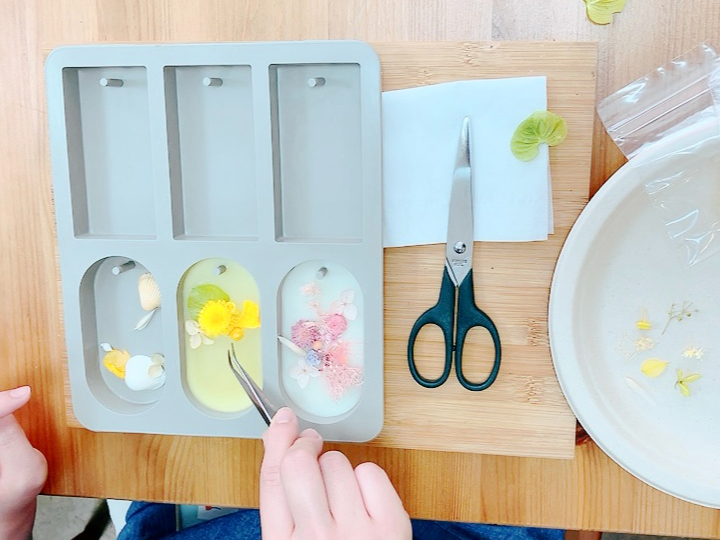 4.型に流したワックスが固まるタイミングで飾りつけします