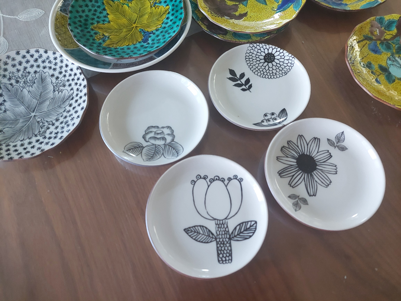 北欧テイストの転写紙を焼き付けた九谷焼の豆皿に