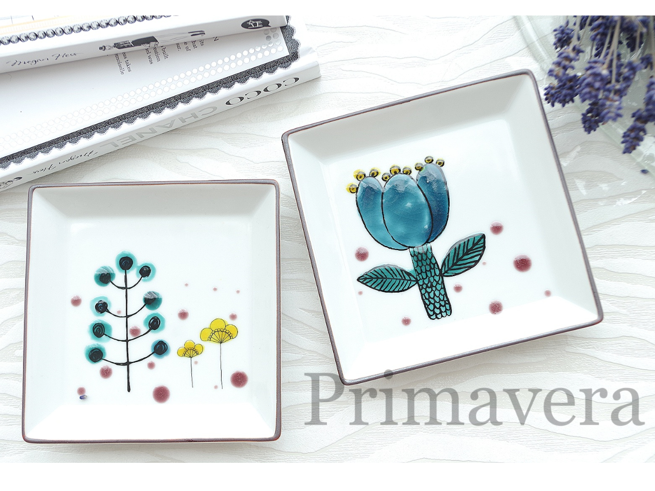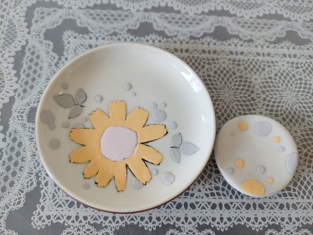 北欧テイストの転写紙を焼き付けた九谷焼の豆皿に