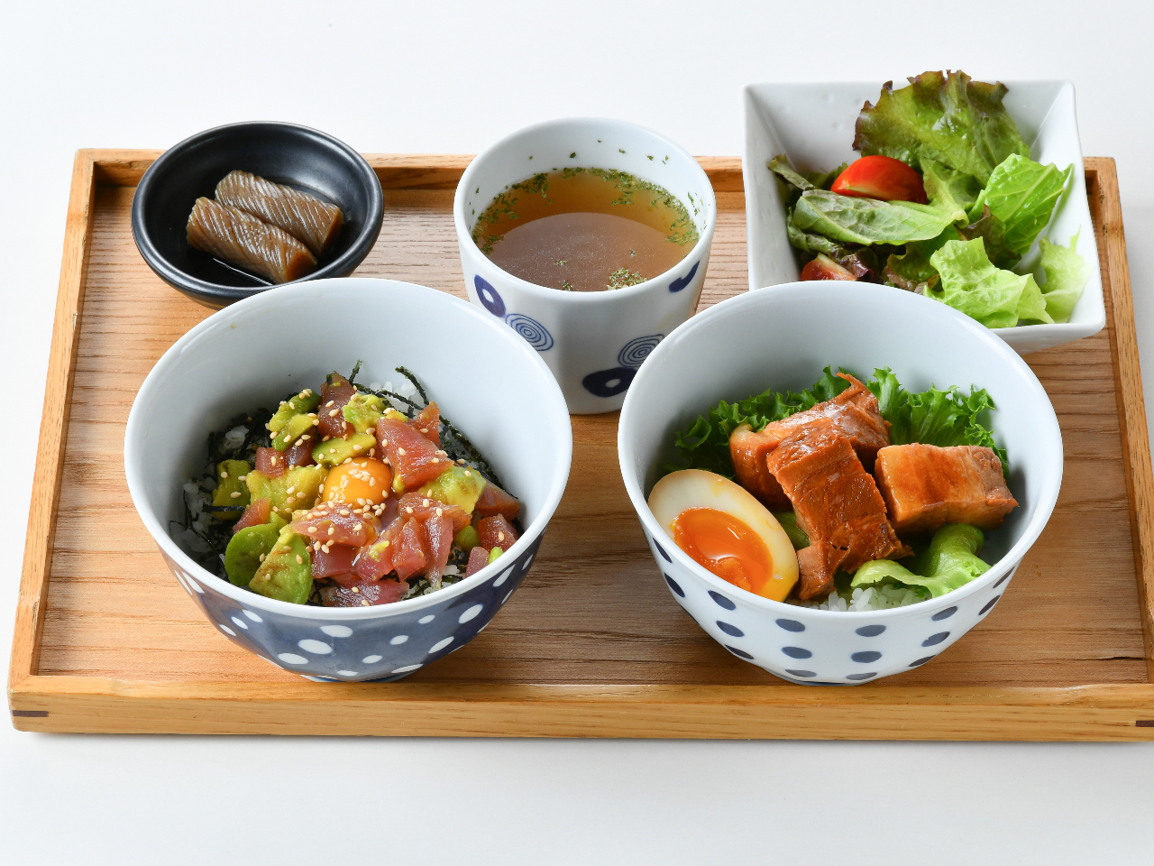 館内カフェ&バー茶茶の人気メニュー「選べるマイ小丼」サラダ・スープ付。7種類の小丼の中から2種類をチョイスでき自分好みの“マイ小丼”が楽しめます。(@牛ビビンバ丼A炙りサーモンといくら丼B焼きチーズキーマカレーCポキ丼D鯛の胡麻ダレ丼E豚の角煮丼F炙り帆立のバター焼き丼※変更になる場合がございます)