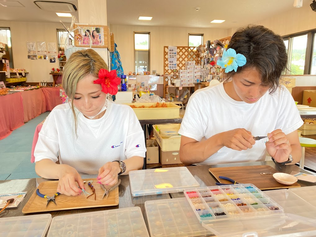 沖縄の海のようなグラデーションの陶器やちむんと琉球ガラスのコラボパーツが人気の体験です
