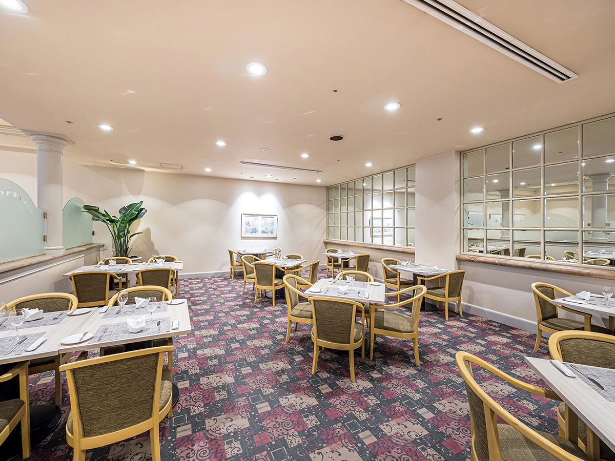 • 回廊から柔らかな光が差し込む、レストラン「フォンタナ」。