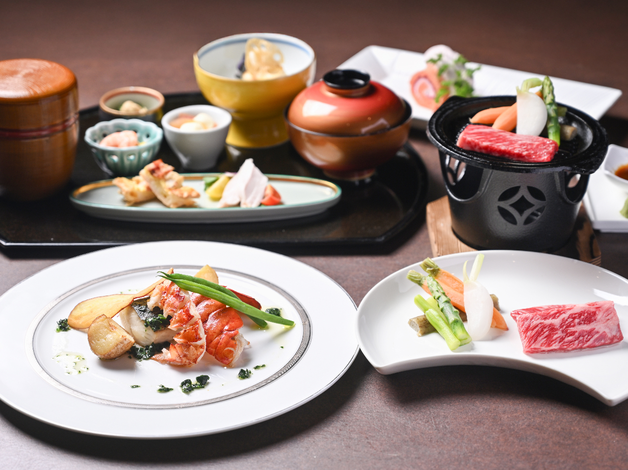 オマール海老やお好みの焼き加減で楽しむ黒毛和牛の陶板焼き。和と洋を使った贅沢なマリアージュコースをぜひバイキング・ビュッフェ・ホテルレストラン