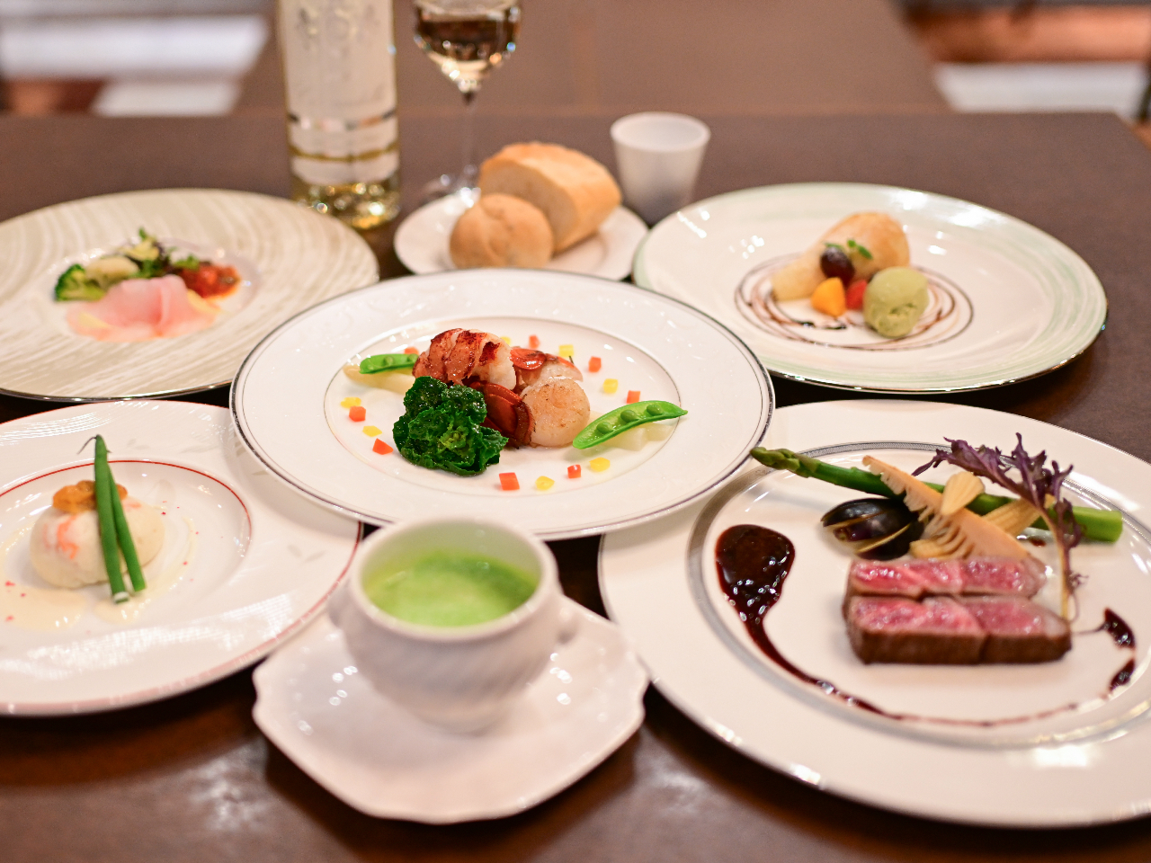 季節の旬の食材を使ったシェフ渾身のフレンチフルコース。オマール海老と国産牛も味わえ贅沢気分を。