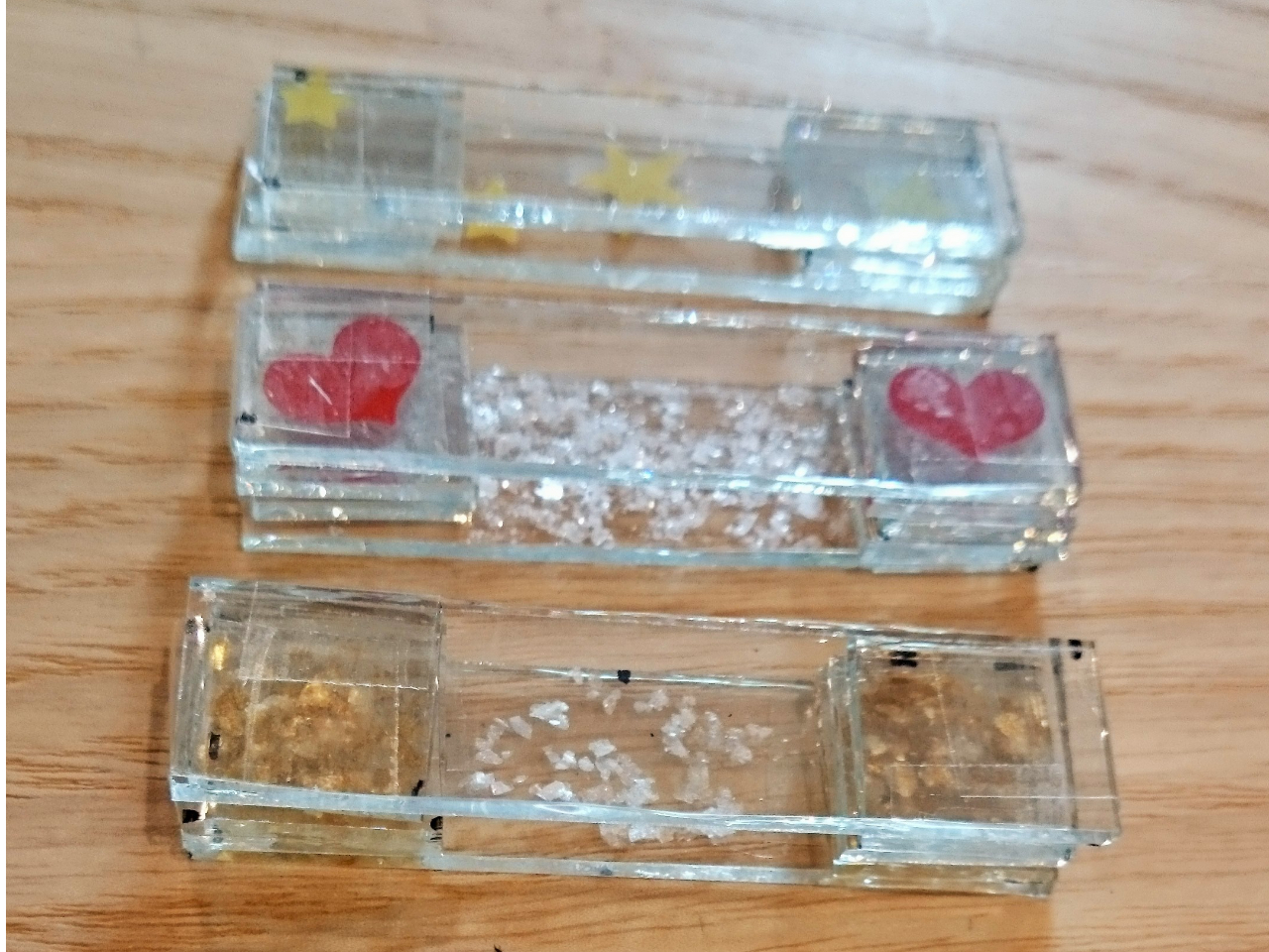 板ガラスをカットして形をつくり陶器の窯に入れて焼く珍しい技法のガラス細工です。