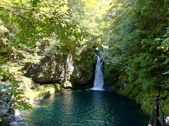 階段の急なことにまず驚き、途中で見えた淵の美しさにまた驚き、階段を降りきって淵の近くに行って滝と水のコントラスト(虹が見えました!)にまたまた驚き、仁淀ブルーを堪能しました。