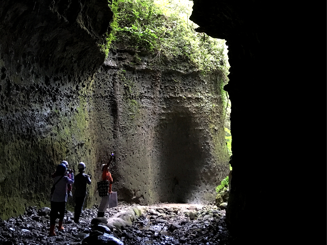 洞窟は周辺が海だった頃、波の浸食により出来た天然の海食洞で、高さ約5m、幅は約3mで全長は約40mほどです。その奥は渓谷に続いていて普段は足を浸すくらいの水が流れ出ています。また洞の壁には貝の化石が見られるところもあります。