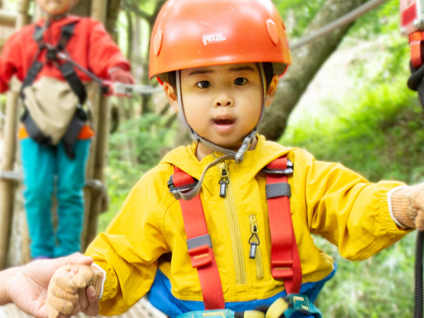 『フォレストアドベンチャー』とは、専用の安全ハーネスを装着して、森の樹から樹へケーブルや、はしごを使いジップライン で空中移動していくフランス発祥のアウトドアパークです。【自分の安全は自分で守る】がフォレストアドベンチャーの大原則。