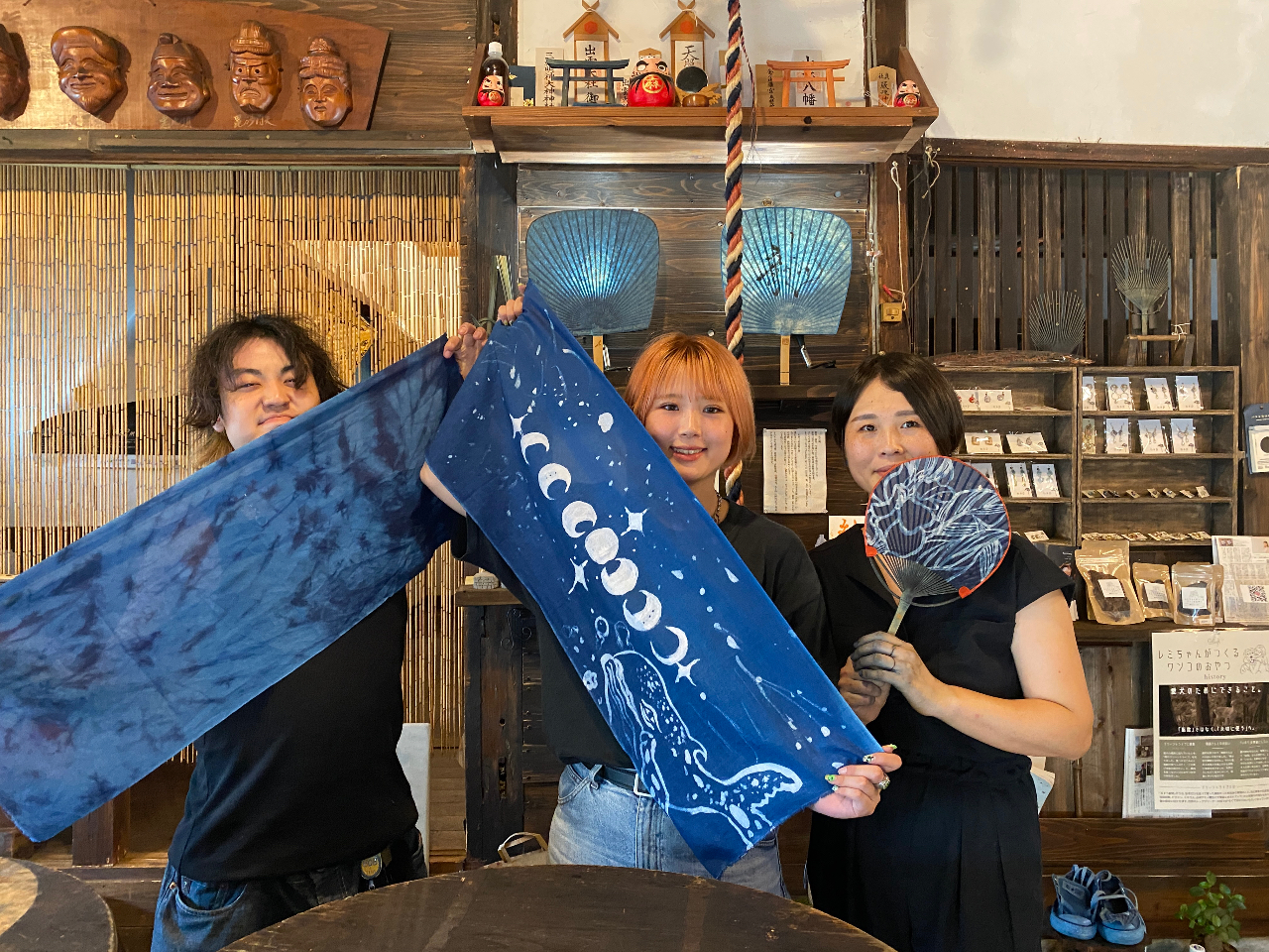 ◎自分で藍染した布がタペストリーと国産の竹のうちわに。2つ制作できます。