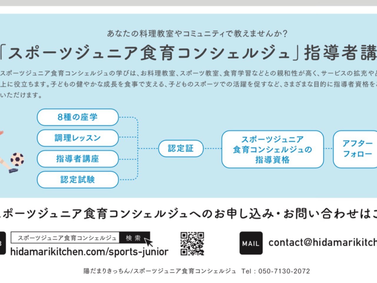 スポーツを頑張るお子さんをお持ちのお母さんのための「スポーツ栄養学を取り込んだ家族料理」と「スポーツ栄養学の座学」が学べるコースです。