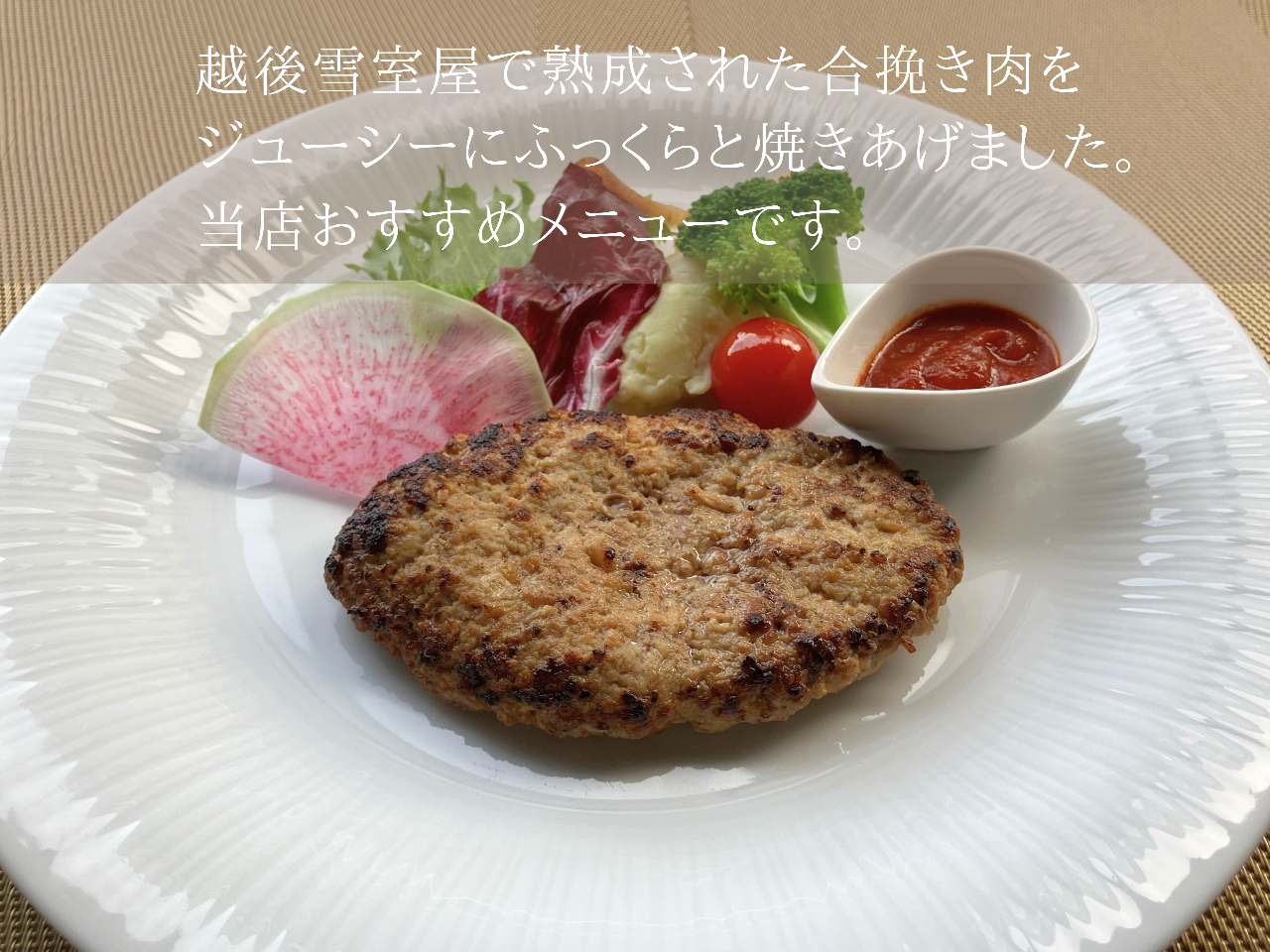 雪室熟成肉のハンバーグにサラダ・デザート・ドリンクビュッフェがセットになったプランです。
