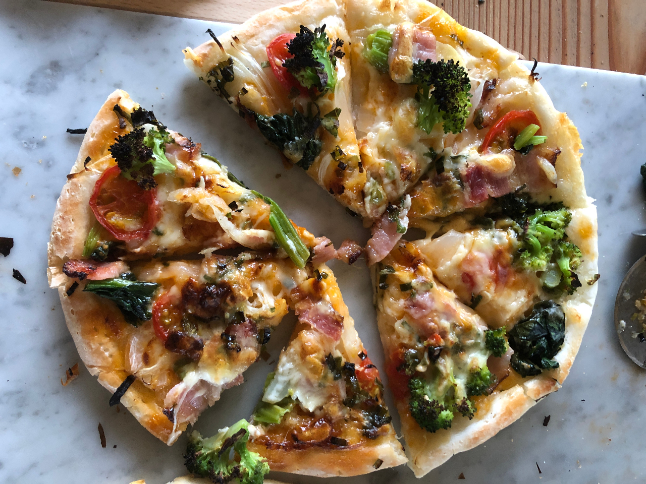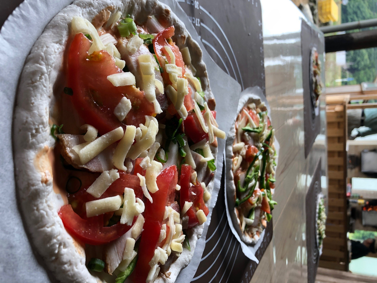 地元の野菜とベーコンをトッピングして石窯で焼きます。