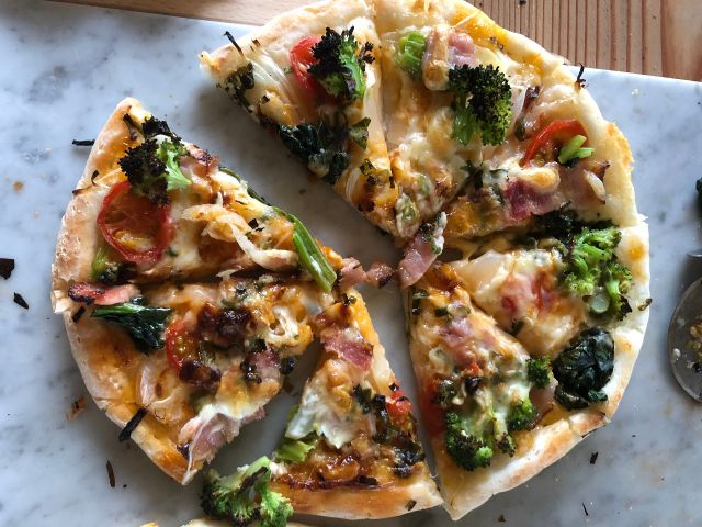 地元の野菜とベーコンをトッピングして石窯で焼きます。