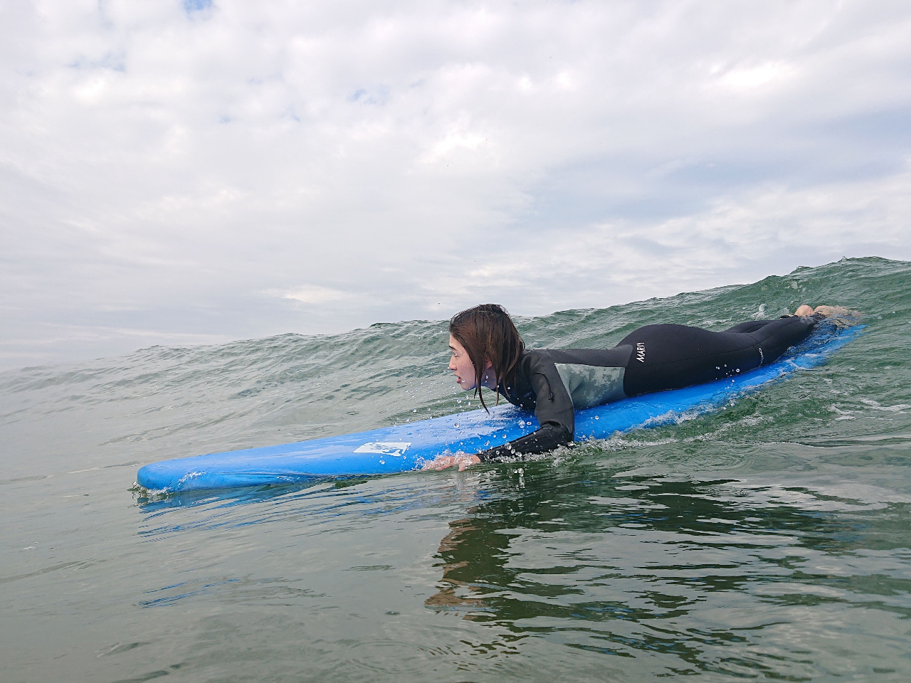一緒にサーフィンをしながら進めていく中で、アドバイスやフォローを入れて行きます。